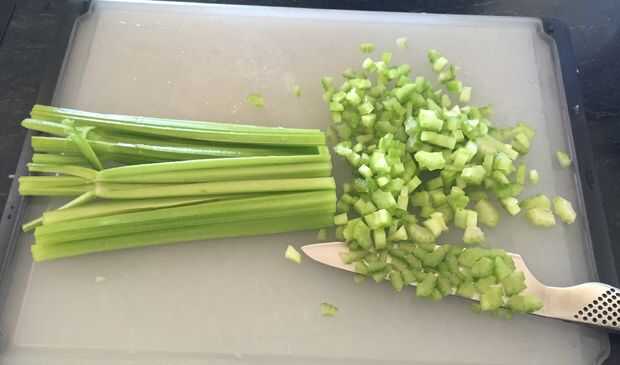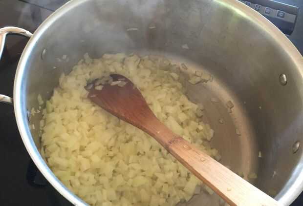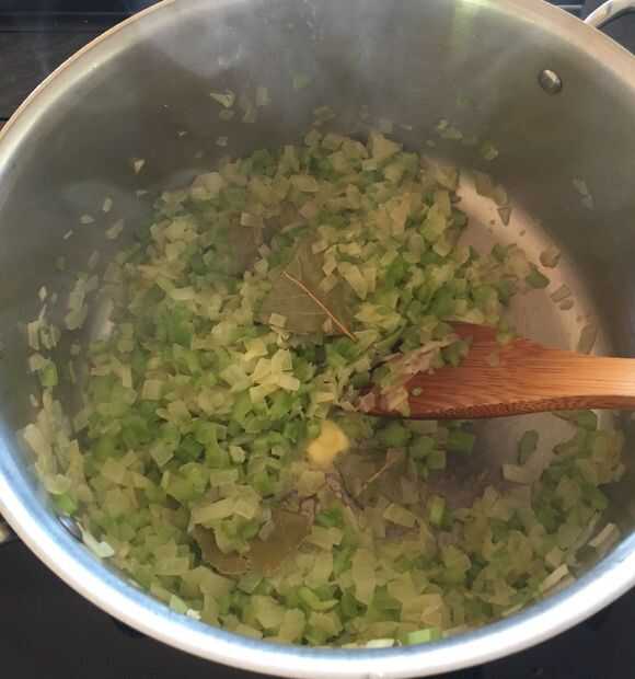 Picar la cebolla y el apio en pequeños trozos del tamaño de un bocado y volcar en la mantequilla con una pizca de sal para la descomposición de la velocidad. Romper dos hojas de laurel por la mitad y añadir a la olla. Cocinar revolviendo según sea necesario, hasta que las verduras estén suaves.