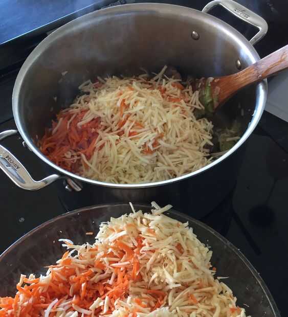 Lavar, pelar, rallar las verduras de raíz y agregar a la olla con la mezcla de carne y apio/cebolla dorada. Si la olla es caliente y seco, puede añadir agua o caldo a la vez para evitar que se queme.