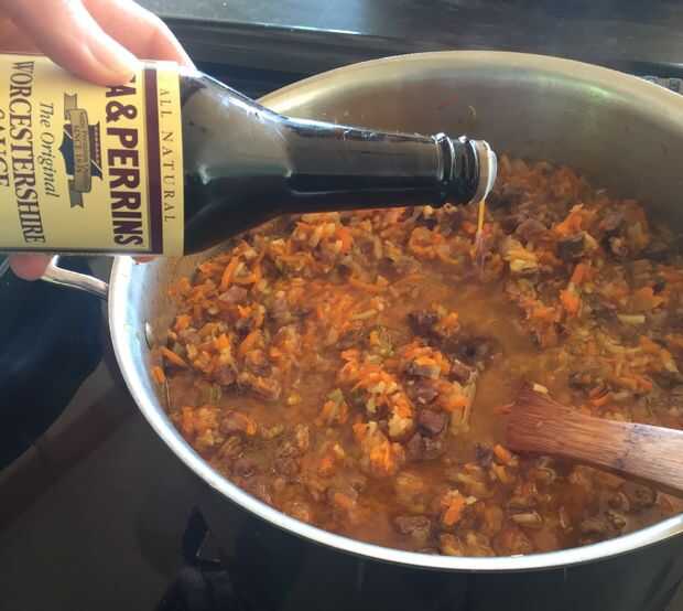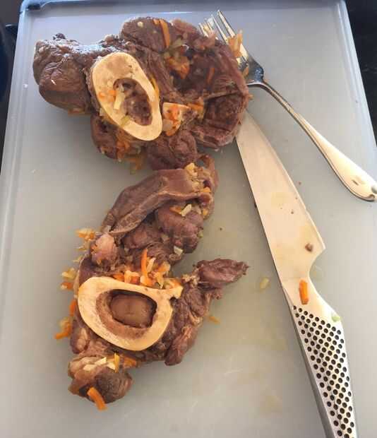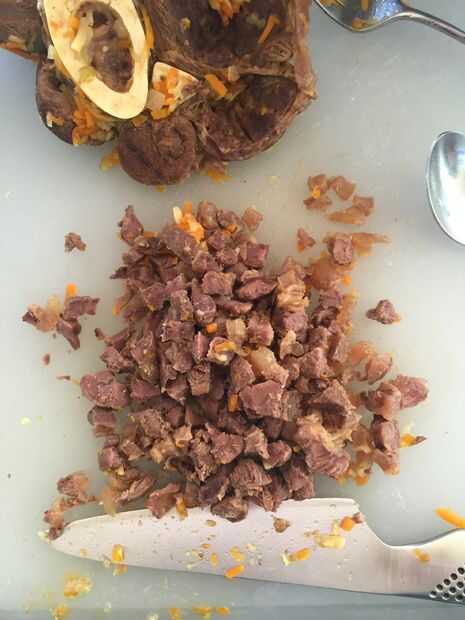 Retire su caña de ternera y dejan enfriar en una tabla de cortar durante unos minutos. Utilice un cuchillo afilado para cortar toda carne y cartílago del hueso, luego picar en trocitos tamaño bocado. Volver carne, cartílago y huesos a la olla y continuar a fuego lento aproximadamente una hora. Picar y agregar frescas de tomillo u orégano, si los tienes, así como una media cucharadita de salsa Worcestershire.