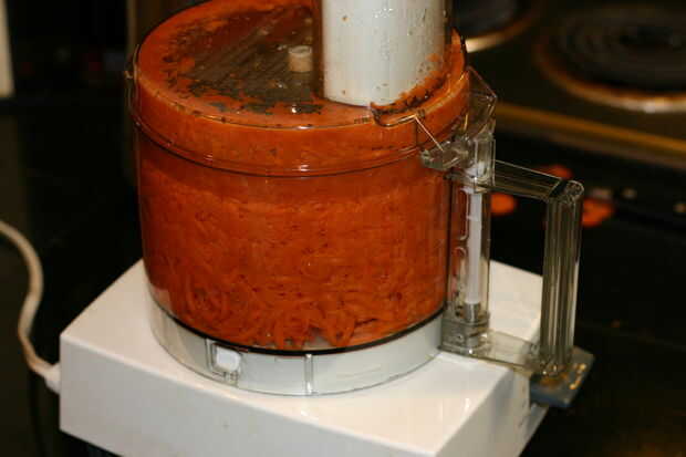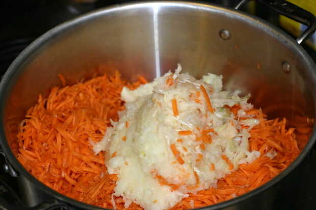 Escala esta receta es muy fácil! Usé 4 libras de zanahorias (aproximadamente 7c rallado) y dos cebollas con 4 cubos de caldo y un puñado grande de jengibre.