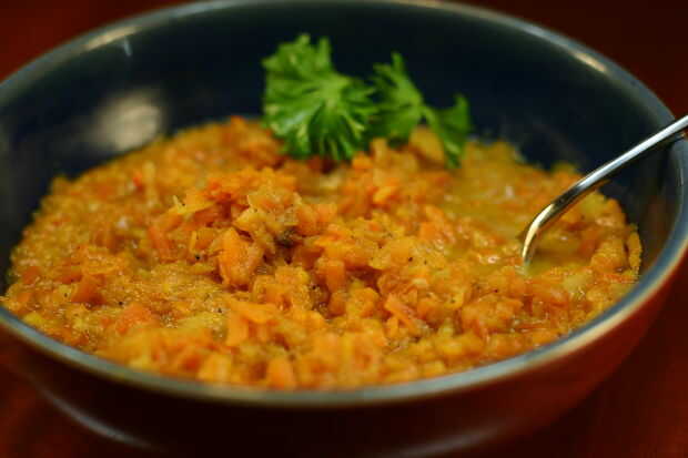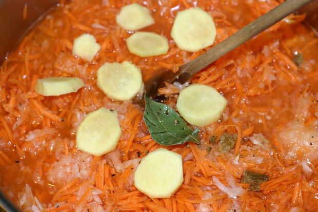 Ralle las zanahorias y la cebolla, añadir a la olla y vierta agua hasta que las verduras sólo están cubiertas. Agregar el cubo de caldo, pimienta, jengibre y Bahía de la hoja. A fuego lento la sopa en baja hasta que las verduras se cuezan y se haya evaporado la mayoría del agua.