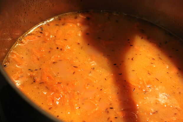 En otoño, las zanahorias hacen una deliciosa crema de sopa de zanahoria con la adición de semillas de alcaravea. Por asar primero las zanahorias en la estufa con la mantequilla, las zanahorias alcanzan un sabor más profundo. Después mezcla las zanaho