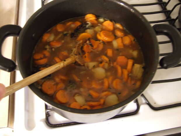 Ahora, añadir unos trozos de pan roto para arriba. He añadido dos rollos de la cena que tenía que poner alrededor, pero puede que desee menos pan (o más, quién soy yo para decirte cómo vivir tu vida?). Revolver la sopa cada pocos minutos hasta que el pan se empapa a través y apenas hierva la mezcla entera y pequeñas burbujas se forman alrededor de los lados de la olla.