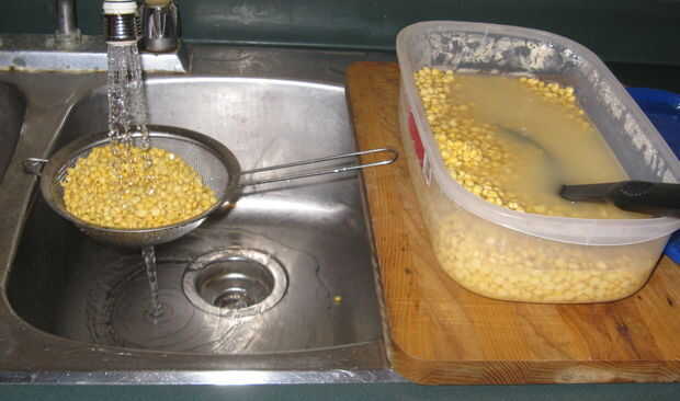 En la mañana enjuagar los guisantes y ponerlos en una olla de 6 cuartos.