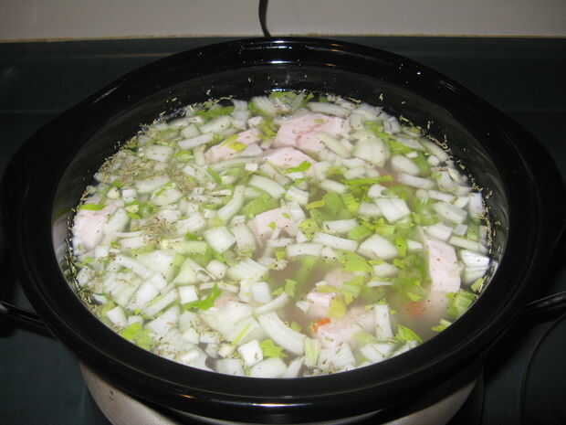 Tapar y cocinar a fuego medio ajuste de 8 a 10 horas o hasta que los guisantes y las verduras estén tiernas.