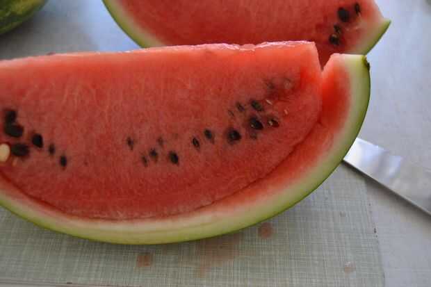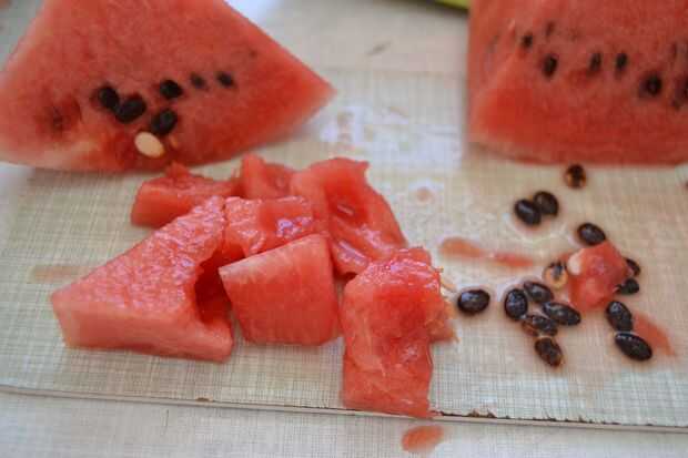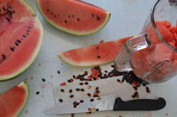 ahora cortar la sandía en trozos y quitar las semillas, poner las piezas en la jarra de la licuadora con los pedazos de tomate.