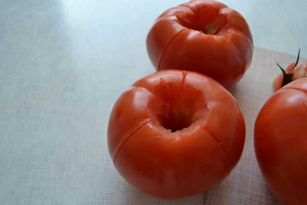 Retire el tallo de los tomates y hacer unos cortes superficiales en la piel.
