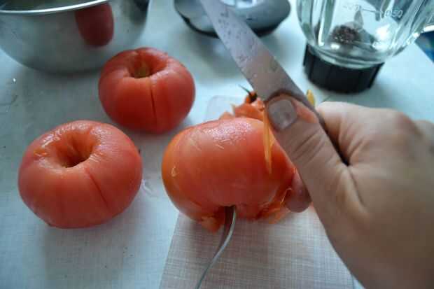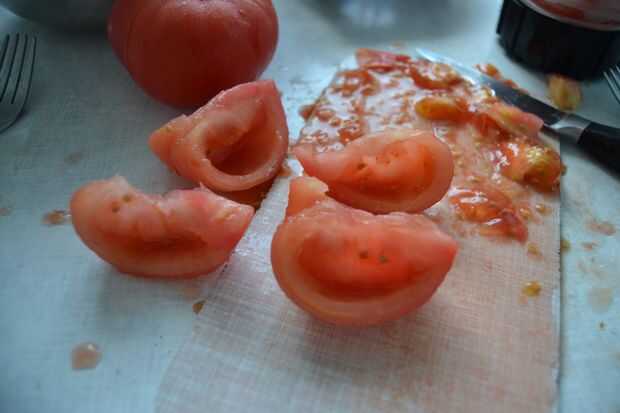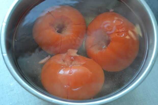 poner los tomates en agua hirviendo durante un minuto, luego retire la piel. cortar los tomates sin piel en trozos y quitar todas las semillas. Este es un asunto muy sucio...