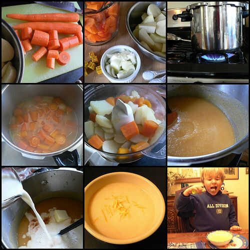3. kid amistosa forma de conseguir comer sus vegetales. Sirva este con queso cheddar, queso y llamarla "Sopa de queso" y mis 3 años de edad es feliz!