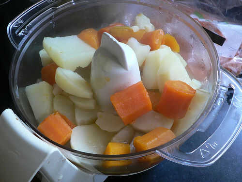 Lo más fácil es uno de los mezcladores de la mano de inmersión --si tiene uno de esos, sólo meter en la olla y mezclar todo, y usted debe poder mezclar todo con muy poco trabajo y ninguna transferencia de la maceta.