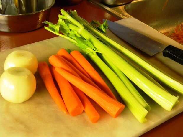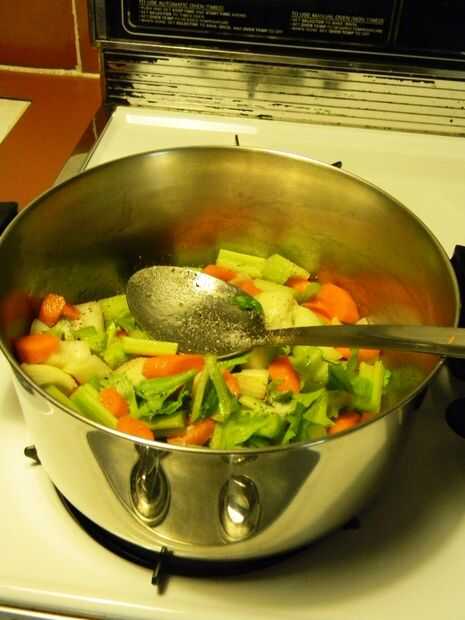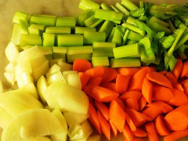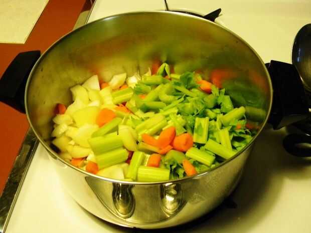 Pelar y trocear las verduras. En una olla grande, añadir 2 cucharadas de oliva virgen extra, ajo en polvo y perejil, apio, zanahorias y cebollas y saltear hasta suave y las cebollas estén transparentes. Sazonar con sal y pimienta.