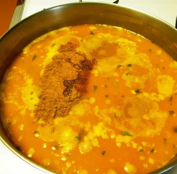 Sopa de calabaza picante con tocino y garbanzos fritos picantes