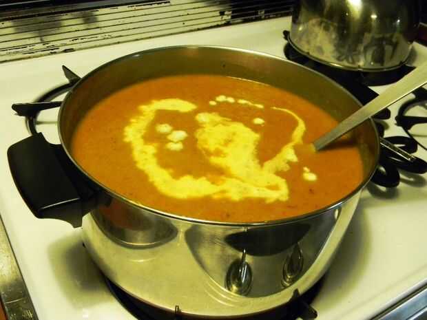Sopa de calabaza picante con tocino y garbanzos fritos picantes