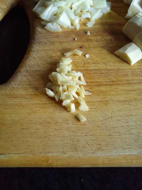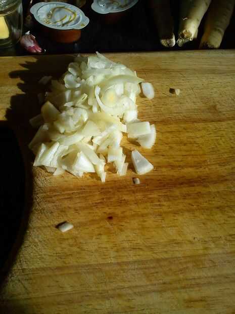 Aproximadamente, picar la cebolla. pelar y cortar las chirivías en cubos de 1cm y unos dados el ajo.