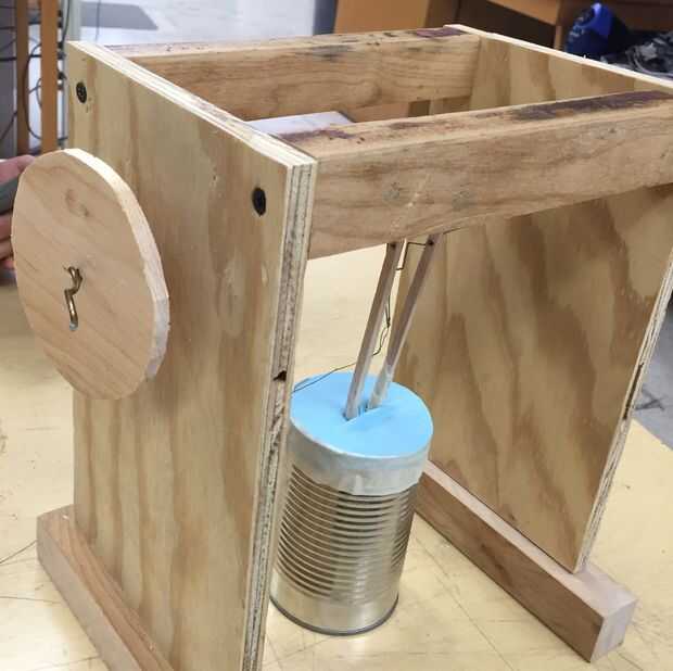 Para entender cómo un motor Stirling convierte en energía térmica en trabajo mecánico, se creará un ciclo de Stirling de una lata y algunos otros artículos para el hogar. Para este motor Stirling de lata, una vela se calienta aire dentro de una lata, causando un cilindro de desplazamiento subir y bajar. El aire desplazado dentro de la can hará que dos varillas de madera girar un cigüeñal, y el cigüeñal gira una rueda.