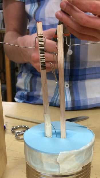 a) el corte dos bielas. La madera debe ser aproximadamente 0,5 cm de ancho. Cortar de 10 cm de altura.