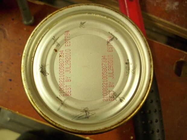 Ahora viene la parte difícil parte 2. En la parte inferior de la lata, hacer una "X" de las cuatro marcas, igualmente distanciada unos de otros. Luego realizar cuatro marcas más, cada uno a mitad de camino entre dos de los cuatro originales. En la parte inferior de muchas latas de sopa, hay 3 o más anillos. Decidí hacer los orificios de entrada de aire entre anillos 1 y 2 y los agujeros de la pierna entre los anillos 2 y 3. Sin embargo, si tuviera que hacerlo en el futuro, yo pondría los orificios de la entrada de aire dentro de anillo uno, para que el aire llegar al centro más que los lados, los lados están cubiertos por los orificios laterales. Además, los agujeros de la pierna, anillo 3 fue levantado ligeramente por encima del anillo 2, hacer apretando el tornillo y consiguiéndolo recto un poco de un problema. Esto resolví empujando el tornillo y la tuerca en el anillo 3, haciendo mella y facilitar un poco las cosas.