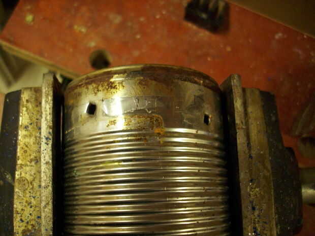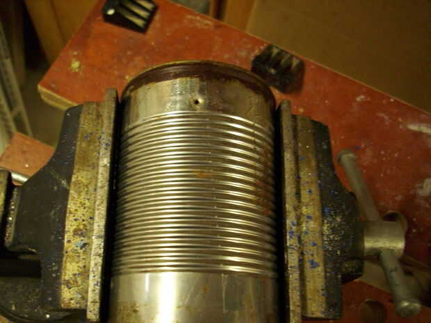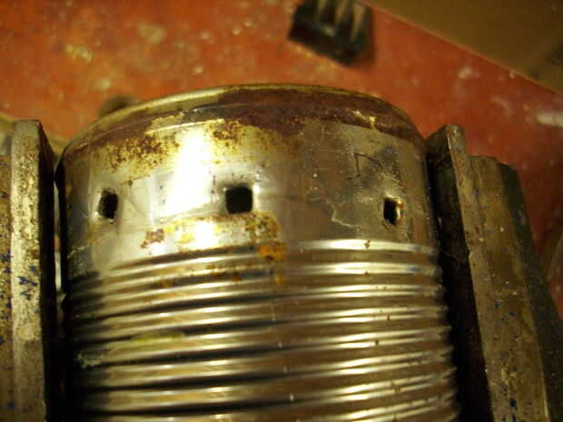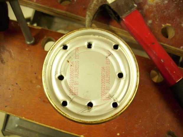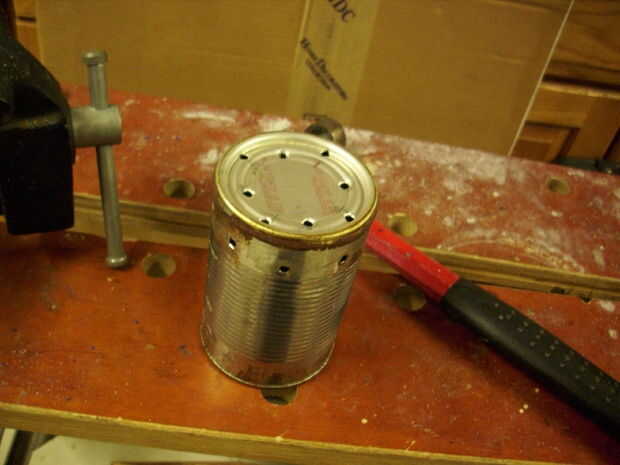 Ahora viene la parte difícil. En primer lugar, usted necesita 8-10 agujeros en el lado de la lata, preferiblemente aproximadamente una pulgada por encima del fondo de la lata. Sujeta la lata en el vicio, luego hacer cuatro orificios, dos pares de dos frente a la unos a otros, para formar una "X". Entonces, hice cuatro agujeros más, a medio camino entre los primeros. No es demasiado importante que estén todos en el mismo nivel tanto como de lo que son suficientes para permitir que grandes cantidades de aire en.