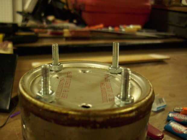 Para comenzar, usted necesitará poner un tornillo a través de los orificios en la parte inferior. Si hiciste los agujeros entre dos anillos diferentes, te sugiero poner los tornillos a través del conjunto exterior, añadir cierta estabilidad extra. A continuación, coloque una tuerca en la parte inferior del tornillo y apriete tanto como pueda, por lo que es contra el fondo de la lata. Repetir este proceso tres veces más.