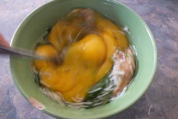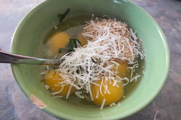 huevos, limón, perejil, pimiento, migas y queso en un bol. Bate hasta que quede bien mezclado.