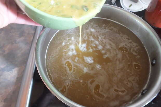 Añada lentamente el huevo en el caldo, batiendo con un tenedor rápidamente hacer girar la mezcla.