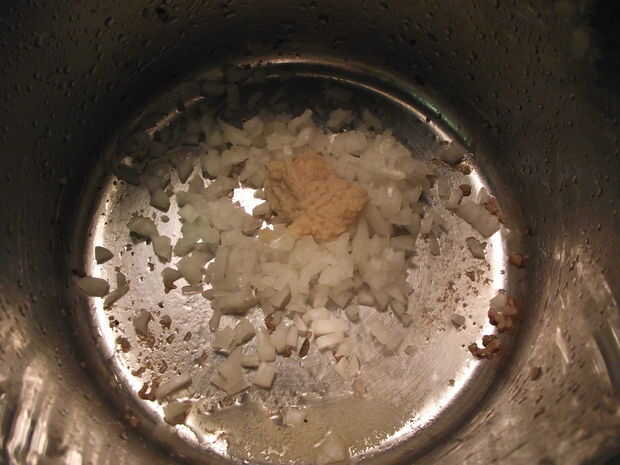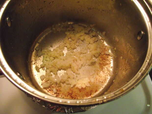A continuación, poner la cebolla picada, junto con el puré de ajo (2 cucharaditas) en una sartén o la olla que vas a cocinar la sopa más tarde y les sudar hasta que estén suaves y translúcidos. Si no estás familiarizado con sudar la cebolla, es muy fácil. Sólo poner la cebolla en la olla sobre fuego medio-bajo y cubrirlas. Agregue alrededor de vez en cuando hasta que las piezas son suaves y translúcidas.