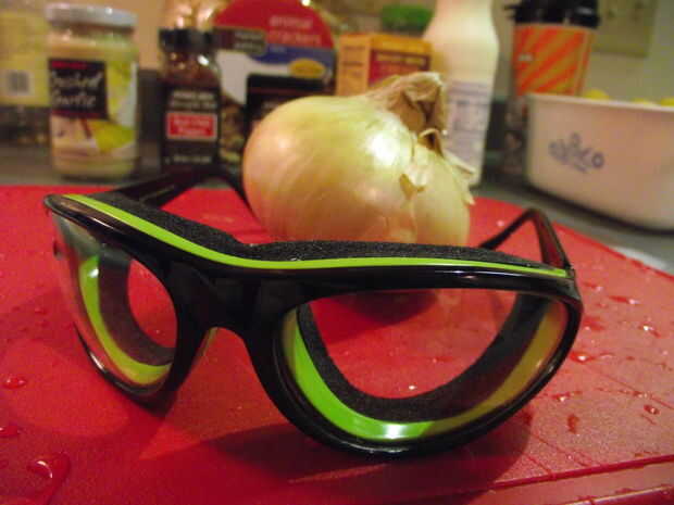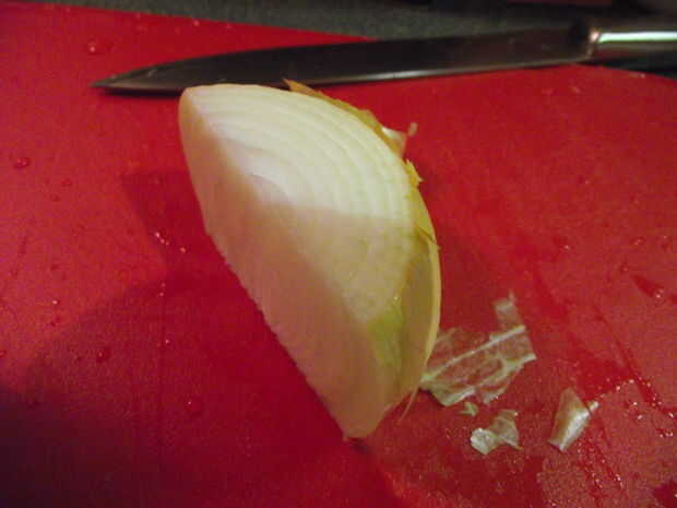 La primera cosa a hacer es preparar la cebolla. Pero, antes de empezar con eso, si tus ojos son particularmente sensibles a los productos químicos en la cebolla que hace tus ojos arrancar, recomiendo recoger algunas Gafas de cebolla. Mis ojos son muy sensibles a la cebolla, hasta el punto que incluso no puedo estar en la misma habitación que alguien picar cebollas, pero el trabajo gafas de cebolla muy muy bien para mí y sin duda hacen cocinar con cebolla mucho más fácil, más seguro y más agradable. De todas formas, la primera cosa a hacer es cortar los extremos de la cebolla. A continuación, Pele la capa exterior de papel. A diferencia de las pieles de nuestras patatas, la piel exterior de cebollas no tiene ningún valor nutricional en absoluto.