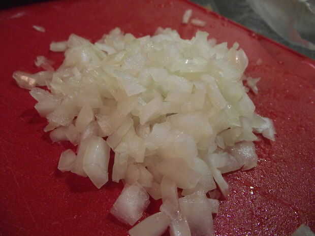 Con la cebolla pelada, es momento de romper nuestro cuchillo otra vez. Primero se corta la cebolla por la mitad. Pegar una mitad en una bolsa y puso lejos para el uso en otra receta, o la próxima vez que usted hace esta sopa y centrar su atención en la otra mitad. Si usted tiene uno de los picadores de golpe, probablemente funcionan muy bien para picar cebolla. Pero si no tienes uno de esos (no) utilizar su cuchillo para cortar la cebolla en trozos medianamente pequeños. Si te sientes algo seguro con sus habilidades de cuchillo, hay una técnica que puede utilizar para hacer un trabajo muy rápido de corte una cebolla en cuadritos. ¡ Mira este video para aprenderlo. De lo contrario, sólo picar la cebolla utilizando cualquier técnica de cuchillo en mano le gusta.