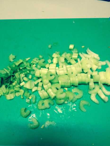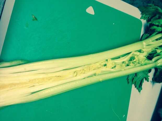 Quitar las hojas exteriores más duras - perfecto para la acción. 3-4 tallos de apio y rodaja de lavado antes de agregar a la olla. Me gustaría añadir un poco de las hojas, pero no muchos ya que pueden ser amargados.