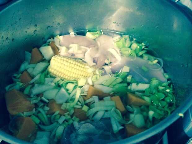 Si elige agregar pollo, pop de ahora. Como el maíz será tierno una vez cocido y se puede cortar el final.