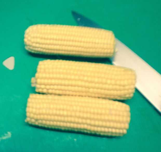 Mazorcas de maíz que tienen hojas y seda sacada y enjuagar bajo agua fría. Poner en el bote entero de todo, sí! Cocinar en la cob agrega un dulce extra, mejor que maíz suelto no proporciona. Una vez que la sopa se cocina, se retiran las mazorcas de maíz y granos de maíz cortaron a devolverse a la sopa.