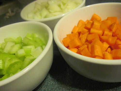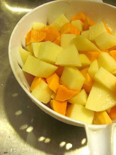 Aquí es donde se inicia el picado. Zanahoria, cebolla, apio. Lavar, pelar y desmenuzar uniformemente - pero no picar en el olvido. Queremos ser hunky chunky! Prepárate unos ajos frescos, porque utilizaremos un montón de. Cortar unas patatas de las variedades blancas y dulce.