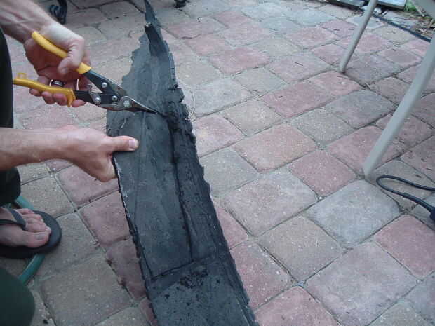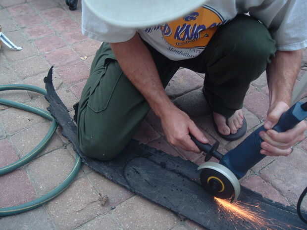 Luego use un disco abrasivo en una amoladora para cortar a través de los cables de acero en la llanta. (muy ahumado).