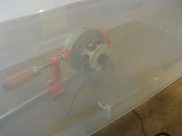 objetos: También, existe el peligro que podrían tener los objetos en el volante, que potencialmente podría ser tirado hacia fuera. Sólo para estar seguro, con él desconectado, llevar el interruptor de encendido, poner el motor la abrazadera para mantenerlo en lugar y sólo un poco más seguro de pequeños proyectiles ligeros, colocar algo entre usted y el motor. He utilizado un recipiente transparente grande. Si tienes gafas de seguridad, puso demasiado. Enchúfelo en un enchufe múltiple si usted tiene uno y luego encenderlo. Esperemos que todavía funciona! Prepárate, va a ser fuerte. Déjela funcionar durante un minuto, observe si aún funciona la bombilla, y si el aire está siendo empujado. He incrustado un video de este paso durante la lágrima abajo de vacío diferente (la tercera) en el paso 16 de este instructable en caso de que sería útil ver.