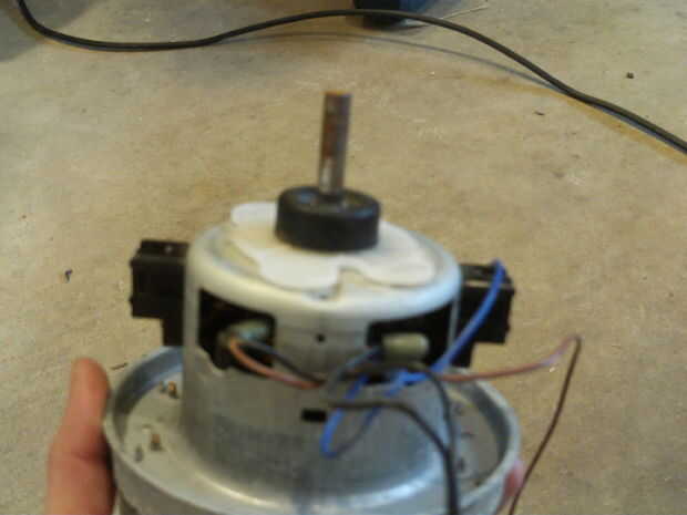 La entrada está en la parte inferior, el aire es empujado a través del motor y los orificios en la carcasa y el eje en la parte superior es lo que usa para girar el tambor de forma de escoba en la cabeza de la aspiradora. El eje sería cool para un uso para más adelante, pero por ahora se quedará solo.
