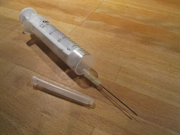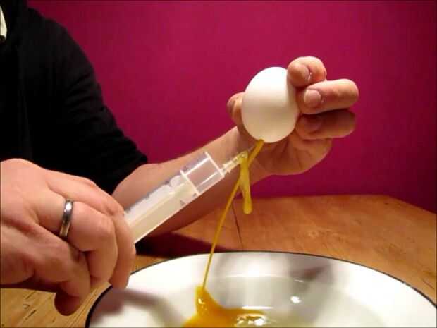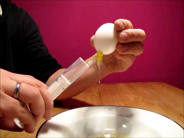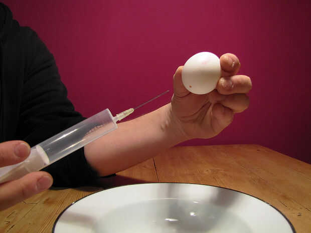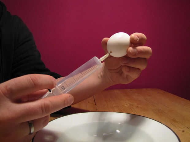 Mantenga el huevo en posición vertical, con el agujero hacia abajo. Poner en la aguja de la jeringa final Presione el aire en el huevo. El huevo es pulsado fuera de la cáscara por la presión del aire dentro del huevo. Saque la jeringa de un llenado con aire otra vez. Repita hasta que la cáscara del huevo está vacía. Llene la jeringa con agua y limpie el interior del huevo de la misma manera.