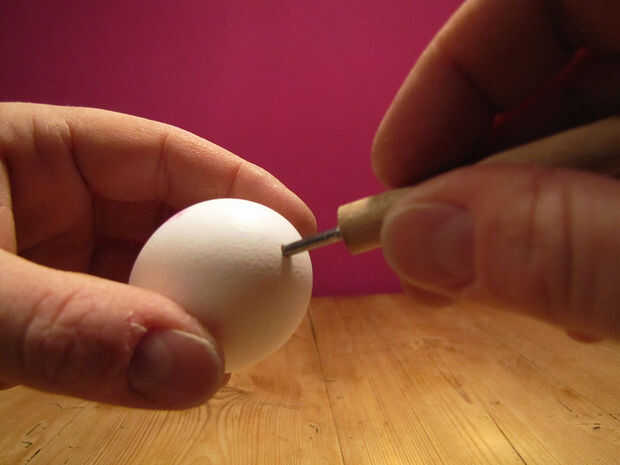 Triturar cuidadosamente a través de la cáscara de huevo. Usted necesita solamente un agujero! El taladro hace un agujero de contorno agradable y fuerte.