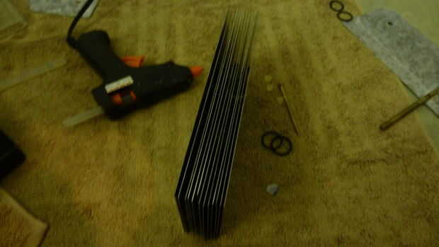 en primer lugar si no tienes tu chapa ya corte (yo tengo la mía fácilmente en la escuela) corta en tamaños sería el equivalente aproximadamente lo mismo que la mano, hacer un número impar de hojas. Ahora, calentar la pistola encoladora. Coloque una pieza de metal en el suelo y coloque a 2 espaciadores en los bordes. Ahora ponemos pegamento cerca cada 4 esquinas de metal. Coloque la placa siguiente directamente en la parte superior. una vez que el pegamento esté seco (menos de 10 seg) Retire los espaciadores y repetir para la siguiente hoja de metal. al llegar a la media hoja ligeramente aumentar por lo que será más fácil soldar más tarde. Cuando listo tendrás hav una célula completa. más pedazos de metal utilizan mejor la célula