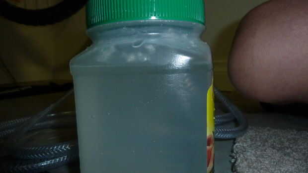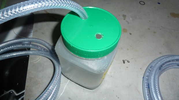 ahora, por cuestiones de seguridad, hice un pararrayos espalda grifo quemadura. Esto es donde utilizas el contenedor de durazno (si se preguntaban wat que se para). llenarlo con agua, entonces que haga dos orificios en la tapa. el tubo del generador de gas va justo debajo del agua pero el segundo tubo está sólo allí para recoger el gas burbujea. de esta manera no hay posibilidad de una explosión en el generador.