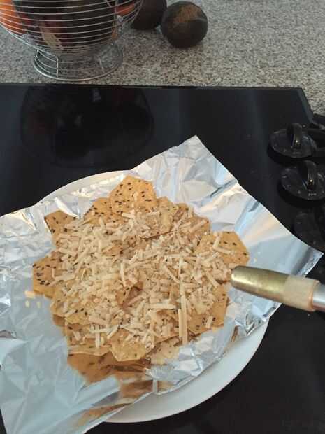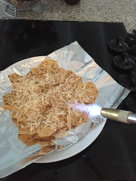 Movimiento a través de la bandeja entera agitar la antorcha sobre el alimento hasta que vea el queso derrita y burbuja. Puede tomar hasta un minuto o tan de incendio para hacer una bandeja de nachos.