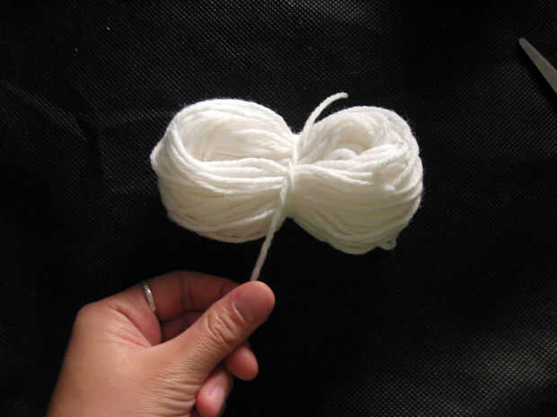 A continuación, corte un trozo corto de hilo y atar alrededor de la mitad del paquete, como se muestra. Nudo doble.