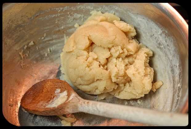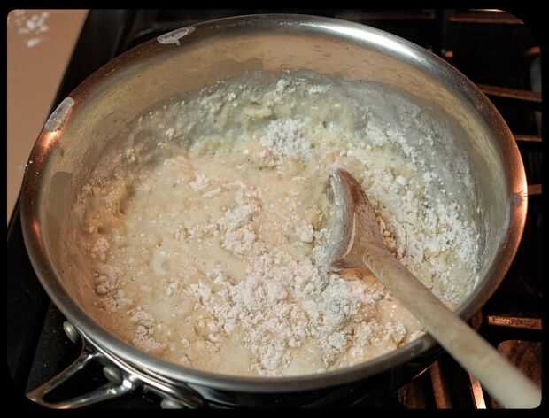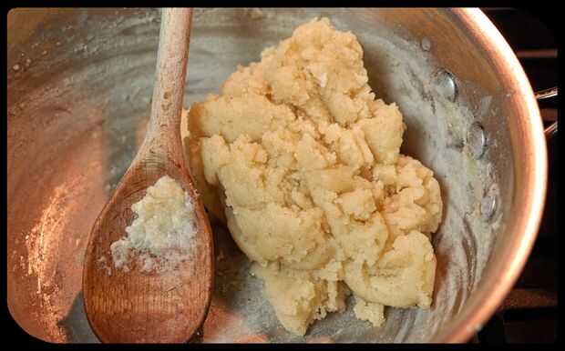 Gire el calor hacia abajo sobre medio bajo y añadir la harina a la vez. Remover vigorosamente para incorporar la harina. Una corteza de harina se forman en los lados del saucier es normal.* una vez que se incorpora la harina y la masa se ha formado, seguir revolviendo por un minuto o dos, esto se seca un poco la masa. Retire la masa de la estufa y agregar a un tazón de la batidora de pie o un tazón de acero inoxidable si eres lo suficientemente valiente para hacer los pasos manualmente.