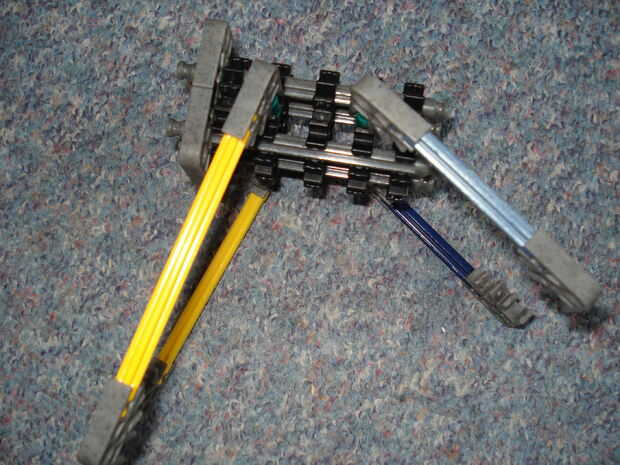 Bueno, aquí es. Funciona con un simple goma cargado percutor diseño, que transfiere energía a la munición después de ser liberado por el mecanismo del gatillo pivotante. Dispara conectores gris con barras verdes, extraíble mag, perno guía, tiene una