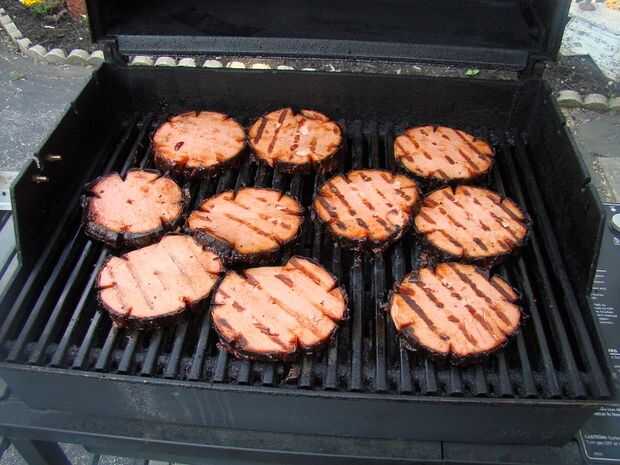 El Bolonia fue quitado de la rosticería y cortar aproximadamente media pulgada rodajas. Se reinstalaron las parrillas de cocción y las rodajas de Bolonia fueron ligeramente a la plancha.