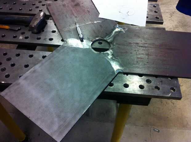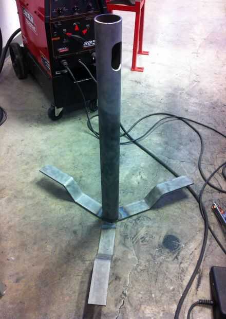 Finalmente, soldó con autógena la parte superior hacia la columna. Alineación tuvo delicadeza un poco, por lo que las piernas se centra con la parte superior. El proyecto fue volteado boca abajo sobre la mesa de soldadura para que la parte superior podría cuadrada, afianzado con abrazadera y soldada en la parte inferior. Entonces el proyecto se coloque en posición vertical en el piso para terminar la soldadura del lado superior y muele suave.
