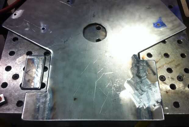 En primer lugar, ingresé a las placas para formar la parte superior, luego las soldaduras al ras del suelo. A continuación he añadido extensiones laterales en un ala para la estación más afiladora. Para combatir cualquier posible diferencia en el espesor del material, soldados les en la parte inferior en primer lugar, con ambas piezas está boca abajo, al ras de la mesa de soldadura.
