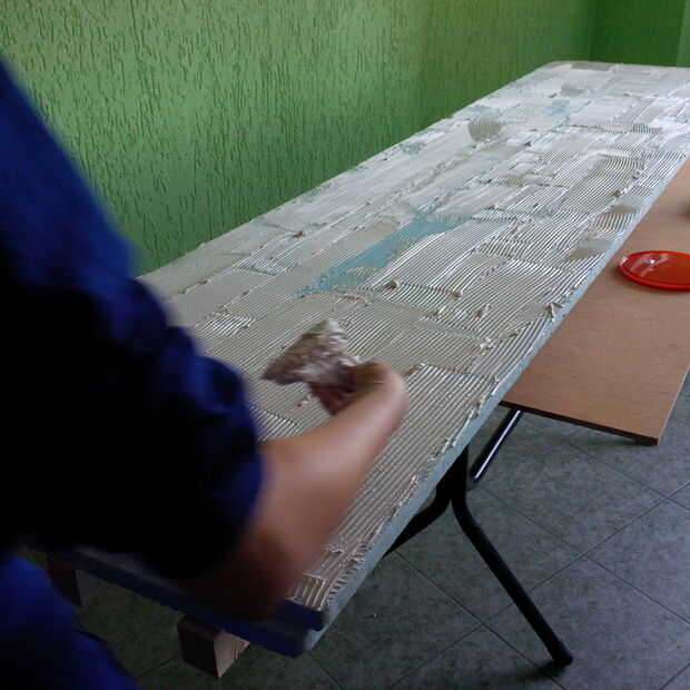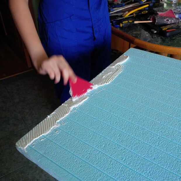 Una de las láminas de aislamiento coloqué sobre la mesa y comenzó a aplicar una capa de cola. Debo haber usé guantes desechables cuando mis manos gooky demasiado pronto.