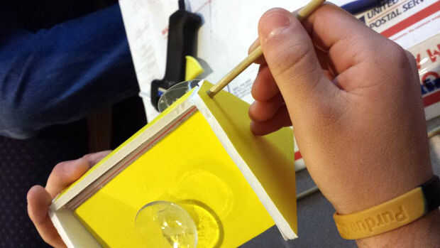Deslice el pasador de madera a través de la Junta Directiva de uno de los extremos, luego a través de la pajita montado en el borde superior del teléfono, montaje tablero y luego a través de la otra tabla de extremo. En este punto, el teléfono portante debe ser colgado del pasador de madera entre las juntas de dos extremos como se muestra en las fotos de arriba.