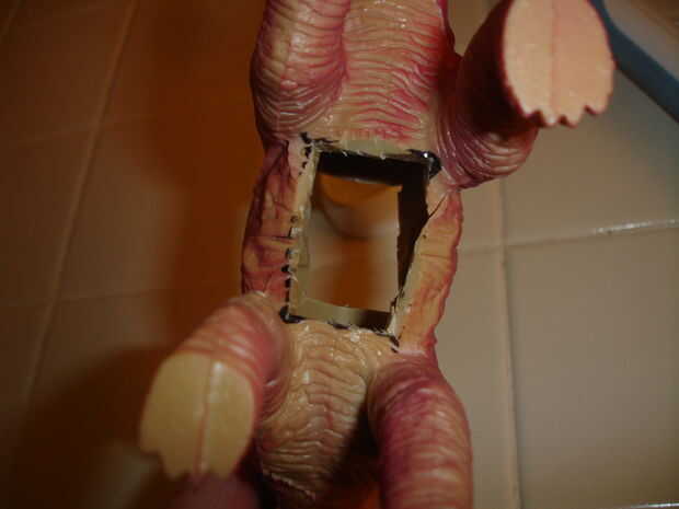 Usando la cuchilla X-acto, corte a través de la parte superior e inferior del dinosaurio. Esto puede ser un poco difícil, así que tenga cuidado de no cortarse. Una cuchilla afilada es clave aquí. El orificio superior debe ser ligeramente más grande que el agujero inferior. Después de que termines prueba hacia fuera la forma de su cepillo de dientes. Si es demasiado pequeño, afeitado de un poco de plástico a los lados hasta que funciona. La clave está en ser lo suficientemente apretada como para sostener el cepillo de dientes en su lugar, pero no tan fuerte que es difícil conseguir el cepillo de dientes hacia adentro y hacia afuera.