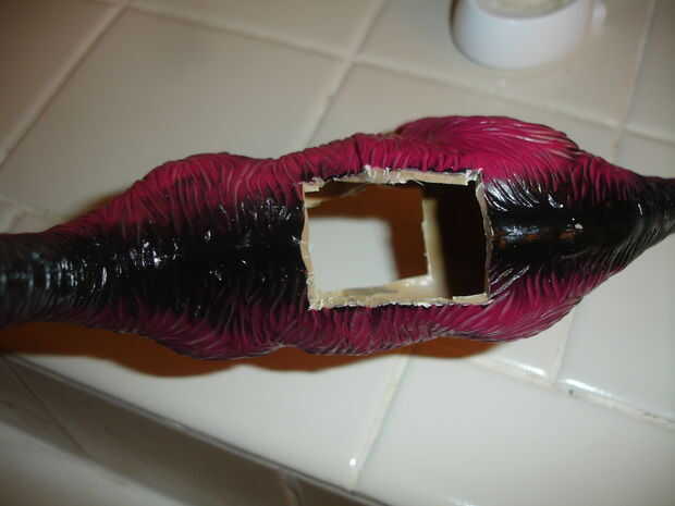 Cuando haya terminado de cortar los agujeros, usted notará que hay un poco de plástico superpuesto, extra donde se unen las dos mitades del dinosaurio. Se puede ver en la foto encima de mi hijos Superman mantel sobre cómo se ve después de que has afeitado apagado el exceso de plástico. Usted querrá estas afeitado abajo para proporcionar acceso más fácil y una mirada más aerodinámica.